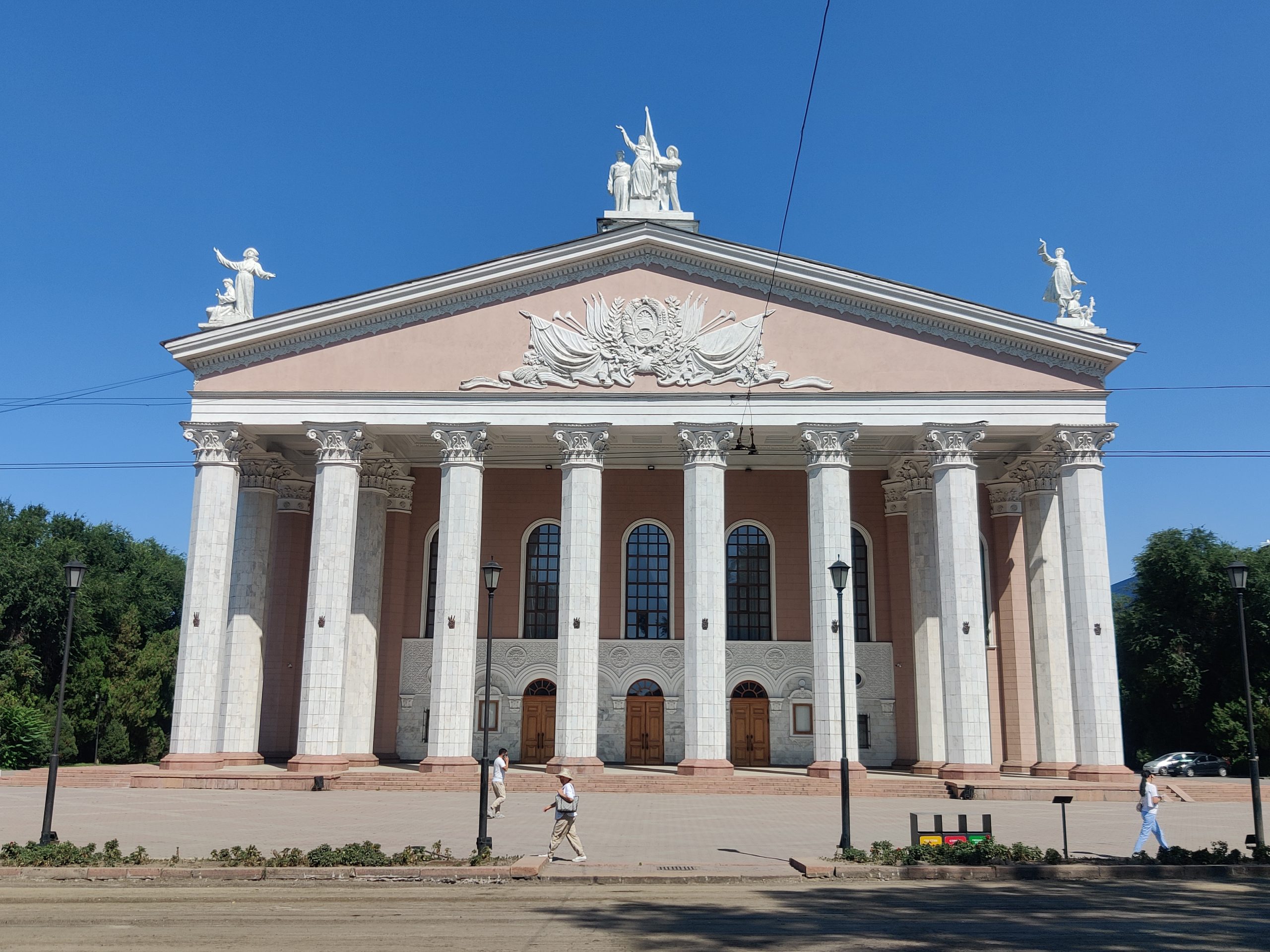Another example of monumental Soviet architecture is the National Drama theater. It showcases classic Soviet design with grand facades and a strong emphasis on cultural significance. When looking at Lenin, it’s the building behind Orozbekov Street, on your right hand side. We recommend walking around, as two concrete frescoes adorn its sides.