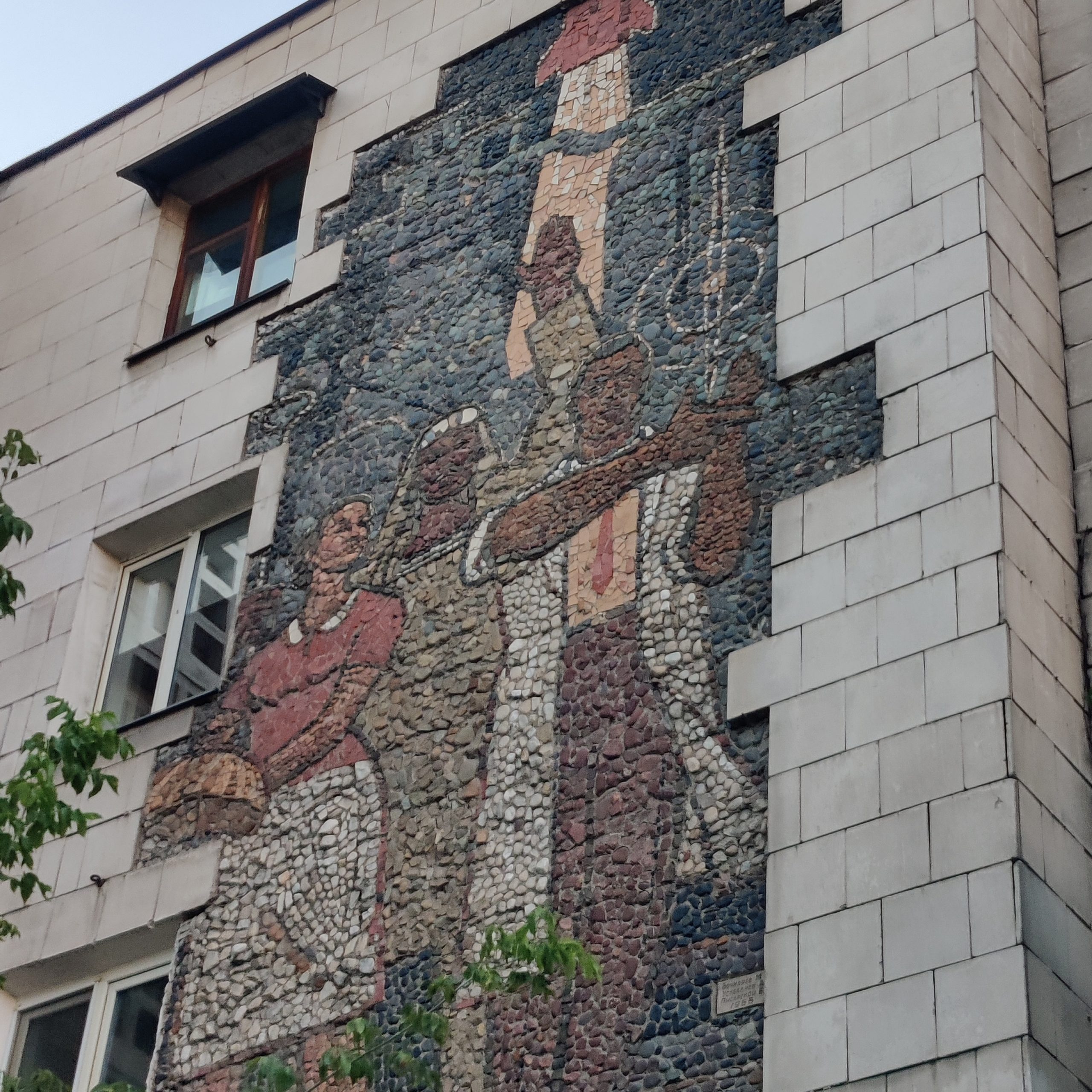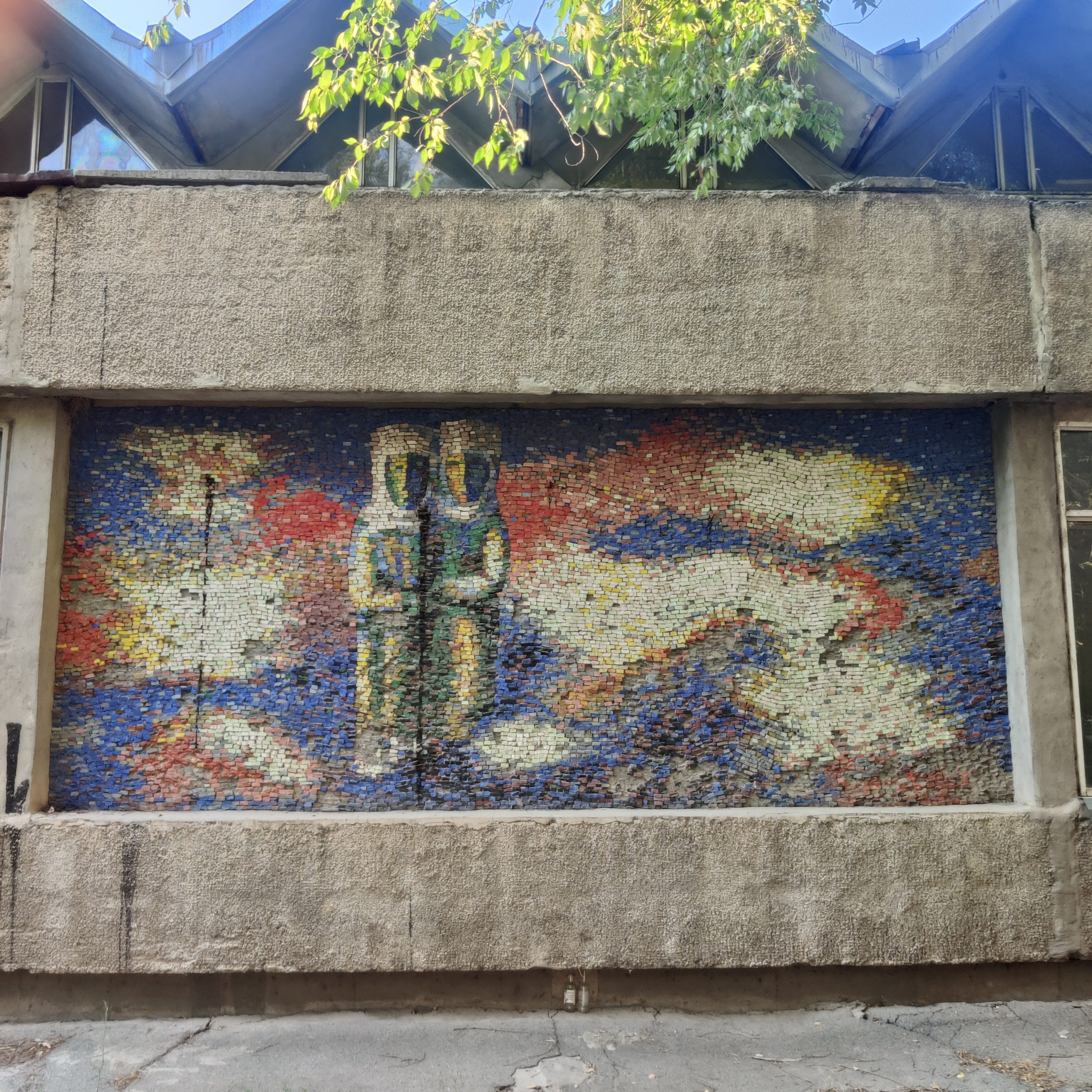 And this is just the beginning. Many more mosaics and sgraffito works await beyond the city center. If you have the time, we recommend venturing out by Yandex or rental car to discover even more. You can find a full overview of Bishkek’s Soviet mosaics, sgraffito, and architecture in our Gallery (simply use the search bar to filter by Bishkek) or our Map.