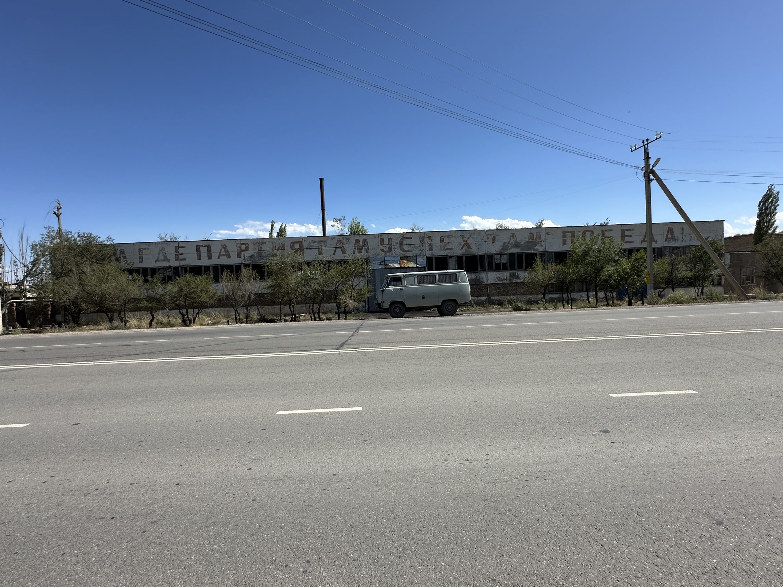 Если вы хотите увидеть больше промышленных артефактов, отправляйтесь в северную часть Балыкчы. Хорошая точка начала — около 42.46655, 76.21089. Здесь находится старая фабрика с выцветшей, но всё ещё различимой советской агитацией на стене.