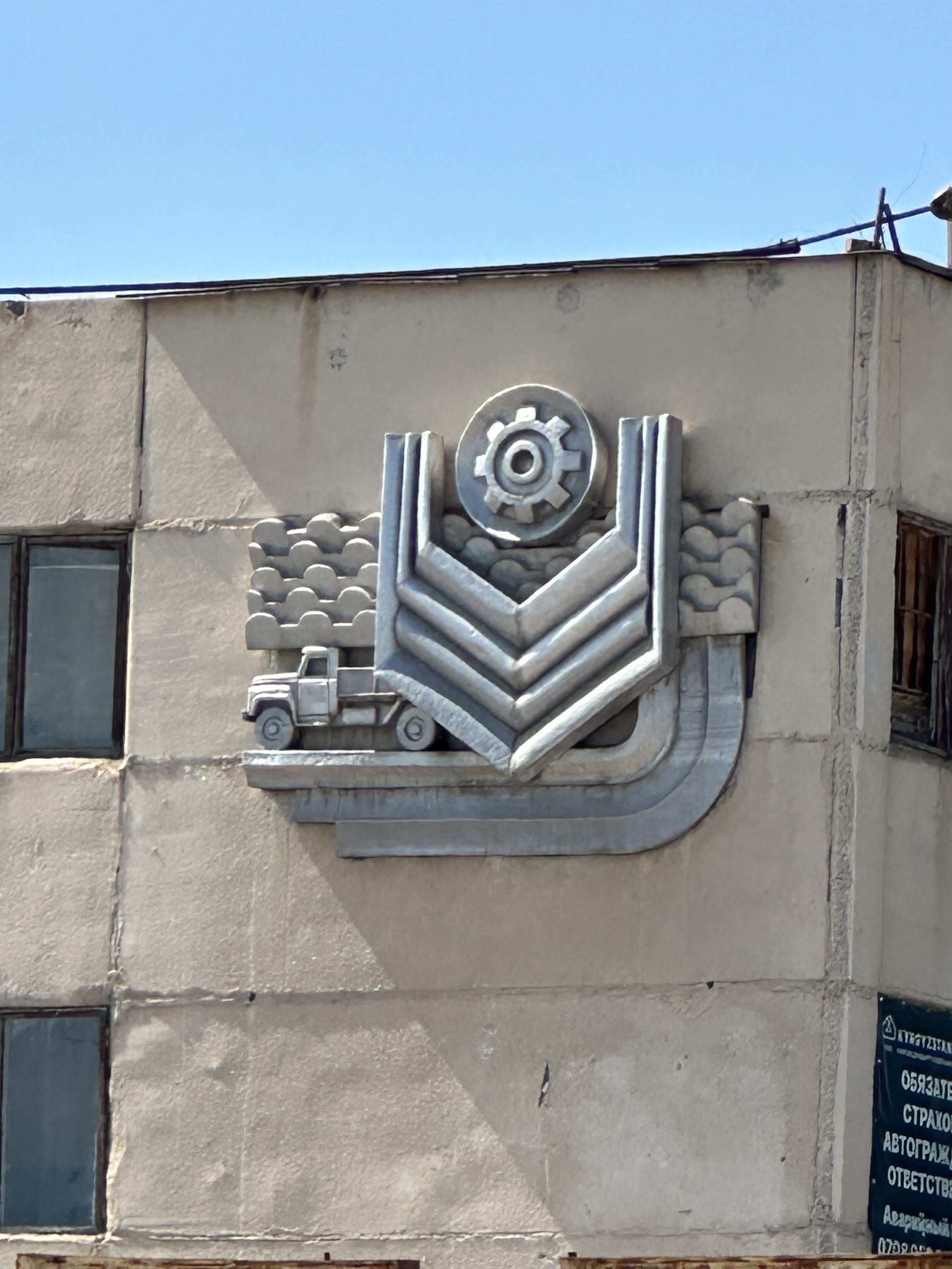 Неподалёку, по координатам 42.4738, 76.21391, стоит ещё одна фабрика с интересными воротами, украшенными серпом и молотом. По периметру до сих пор видны выцветшие флаги бывших союзных республик. По пути также можно остановиться у 42.47009, 76.2151 — здесь хорошо сохранившийся барельеф, отличный пример советского монументального искусства.