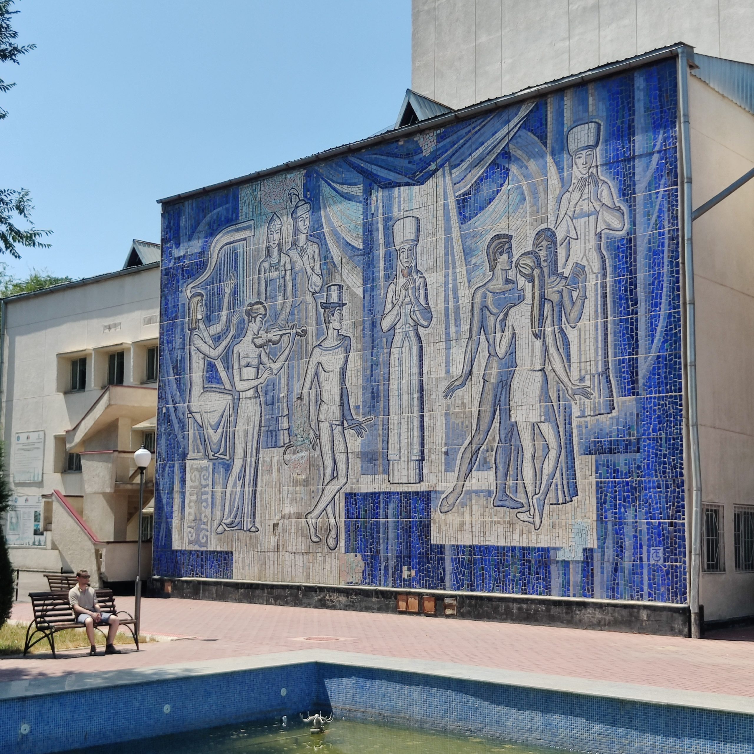 Continue along the avenue and you’ll soon meet the city’s Soviet-era drama theater. Its Southern side is our next stop: a cobalt blue-and-white mosaic. The featured figures —musicians, actors and poets – remind passersby of the USSR’s cultural mission: to uplift the masses through art. The contrast of blue tile against the Central Asian sun is breathtaking. It was completed in 1974. Be sure to take a quick look at main facade, which has an interesting stained glass window.