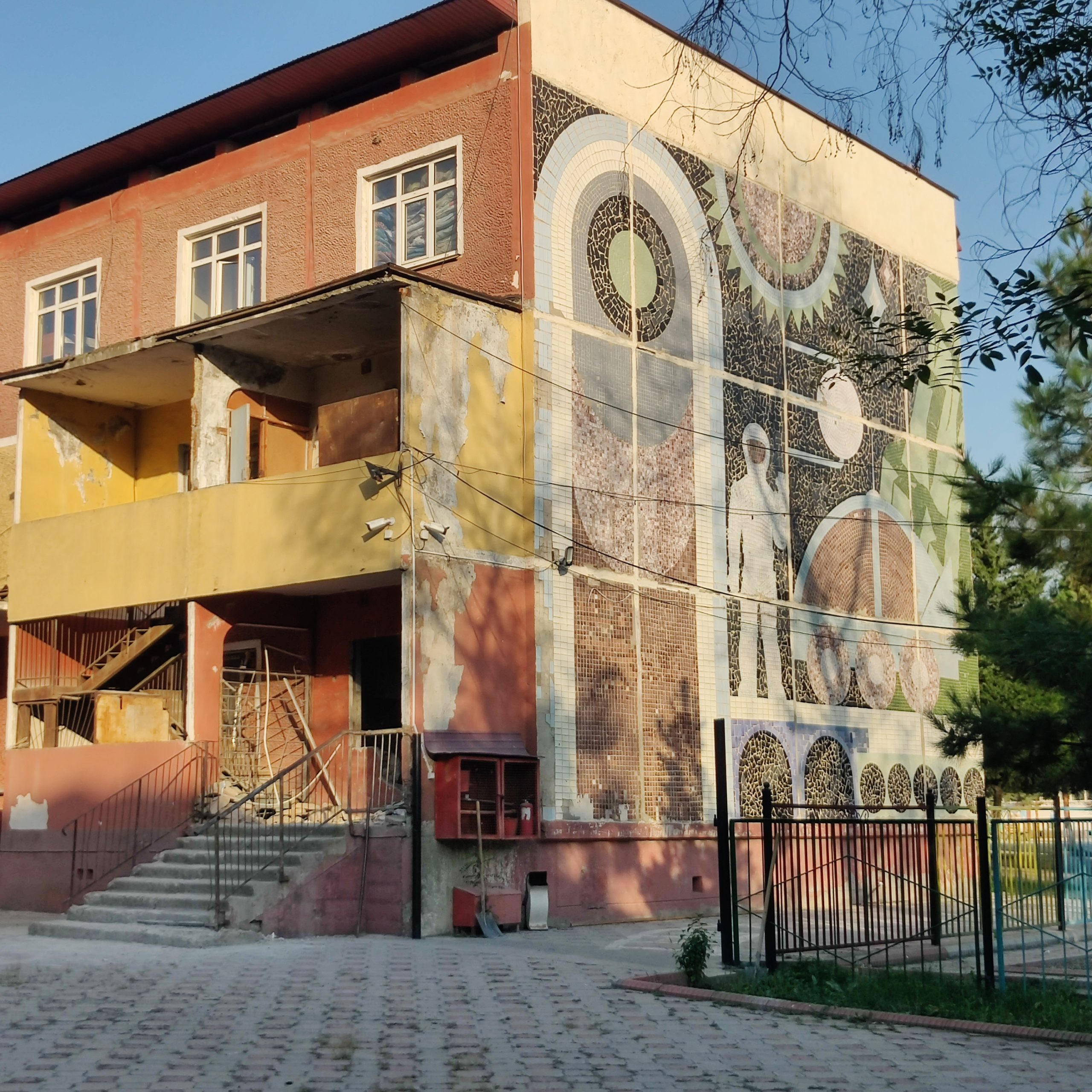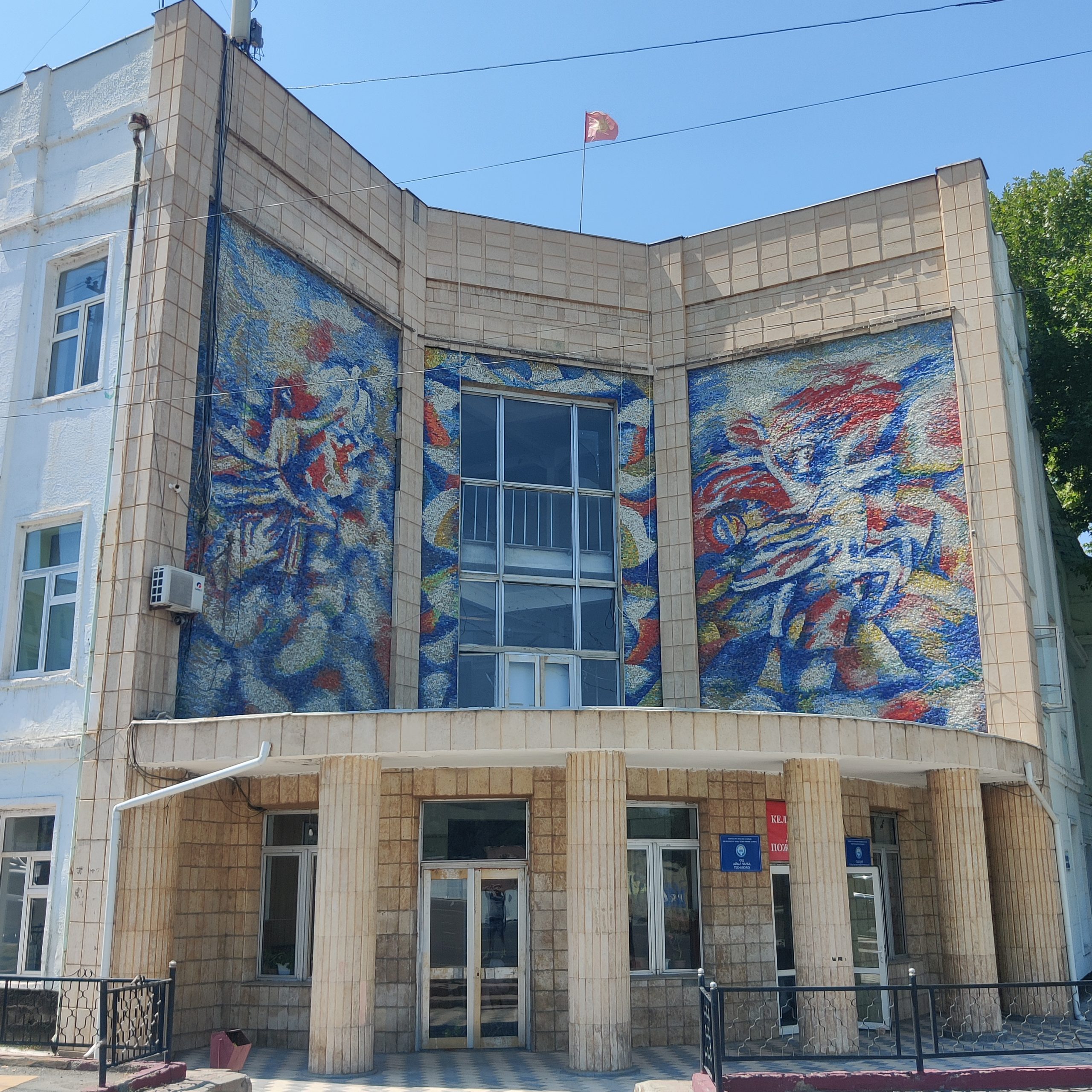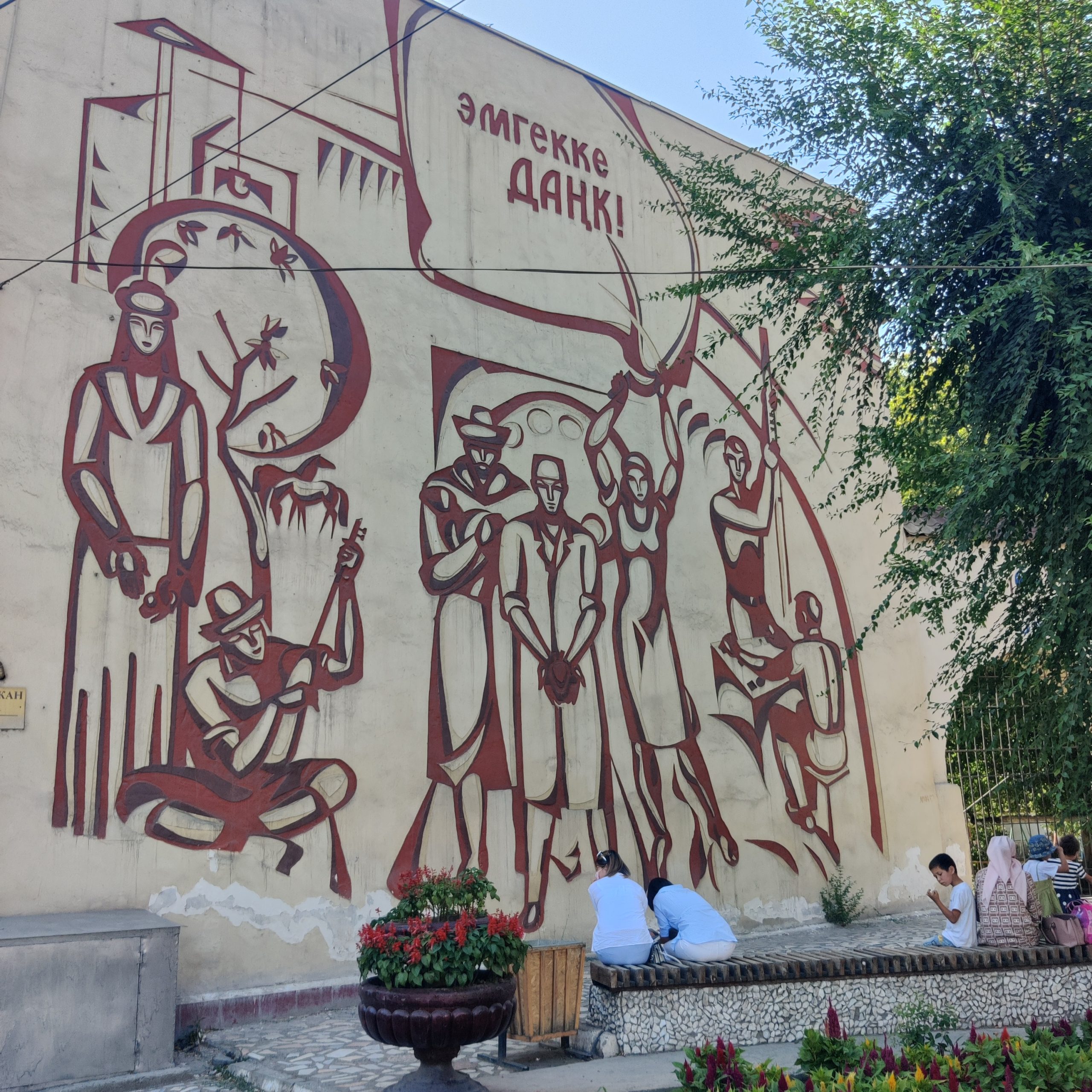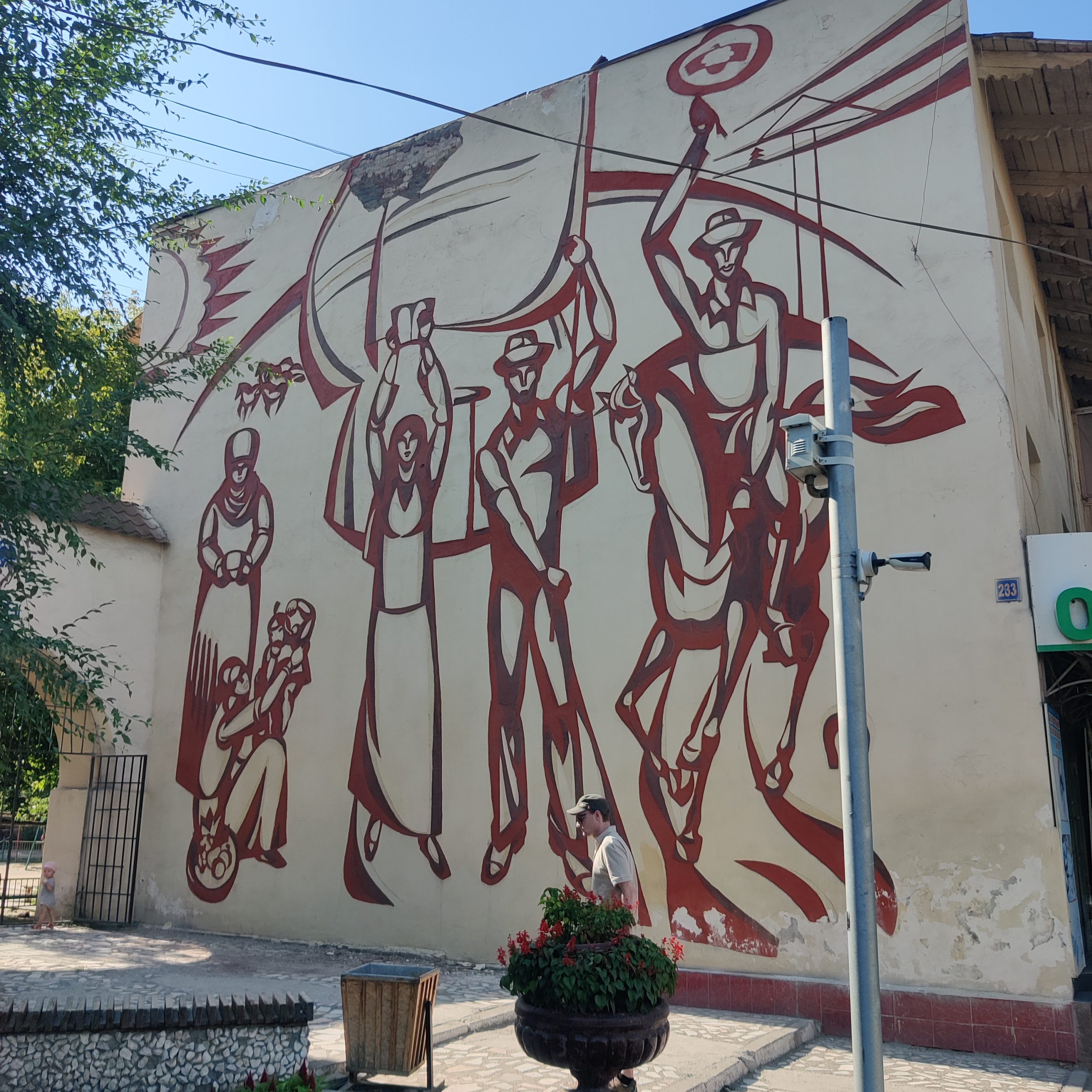Just a few meters ahead, two monumental sgraffito murals fill the walls. They display a series of workers in traditional Kyrgyz clothing. In the composition, of which all accents are painted in a blood-red coloring, we can see a man riding a horse, a woman holding a sickle and the slogan “Glory to work”. In the past it also included Lenin’s face, but I has been removed unfortunately!