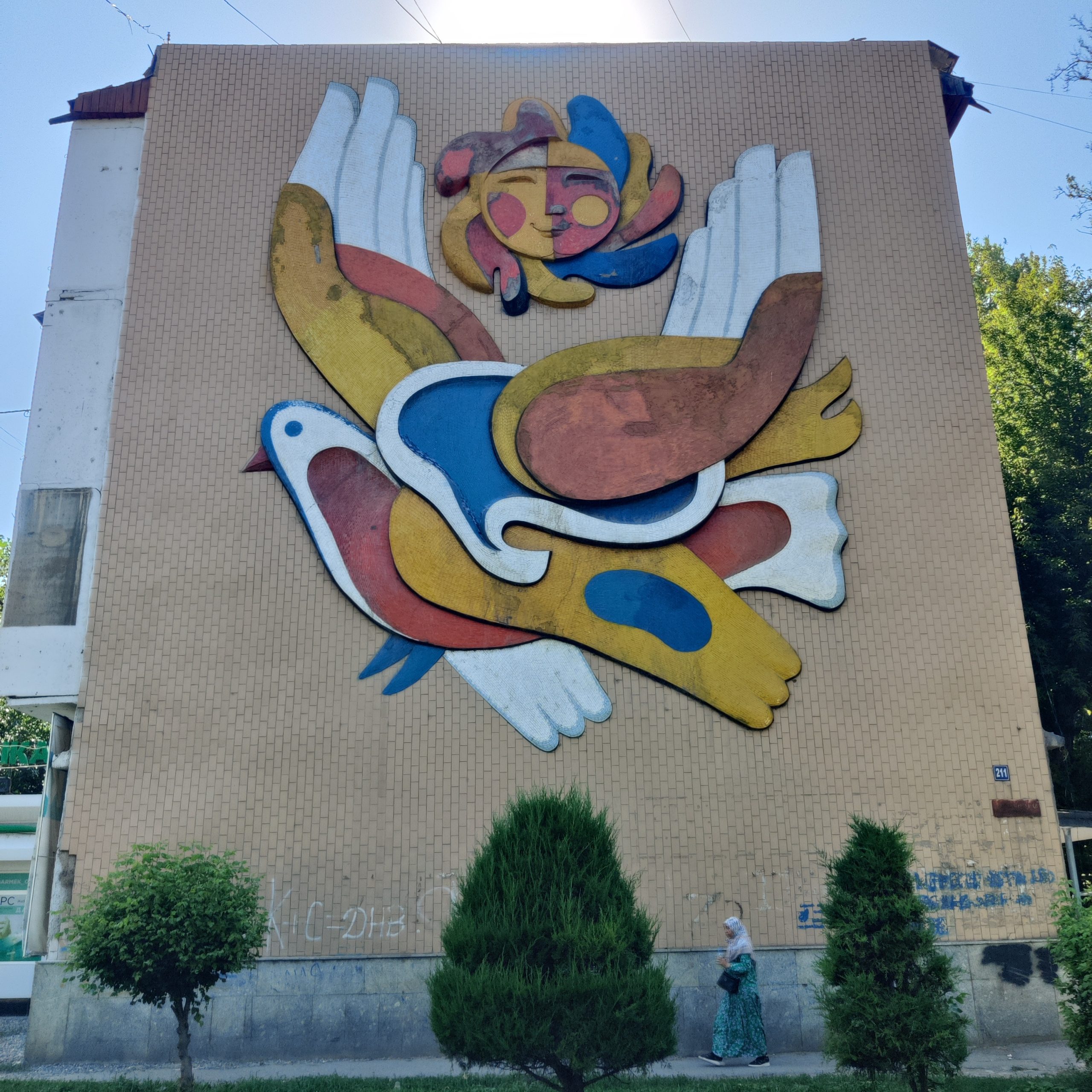 Head right at the next crossing, following Kurmanjan-Datka St. Tucked along is a gentle surprise: a pastel-colored dove mural from the 1970’s. The white dove, covered in colorful decorative layers, was likely a Cold War-era emblem of peace — perhaps naive, yet sincere. It’s an unexpectedly tender moment amid the brutalist vibe of the tour.