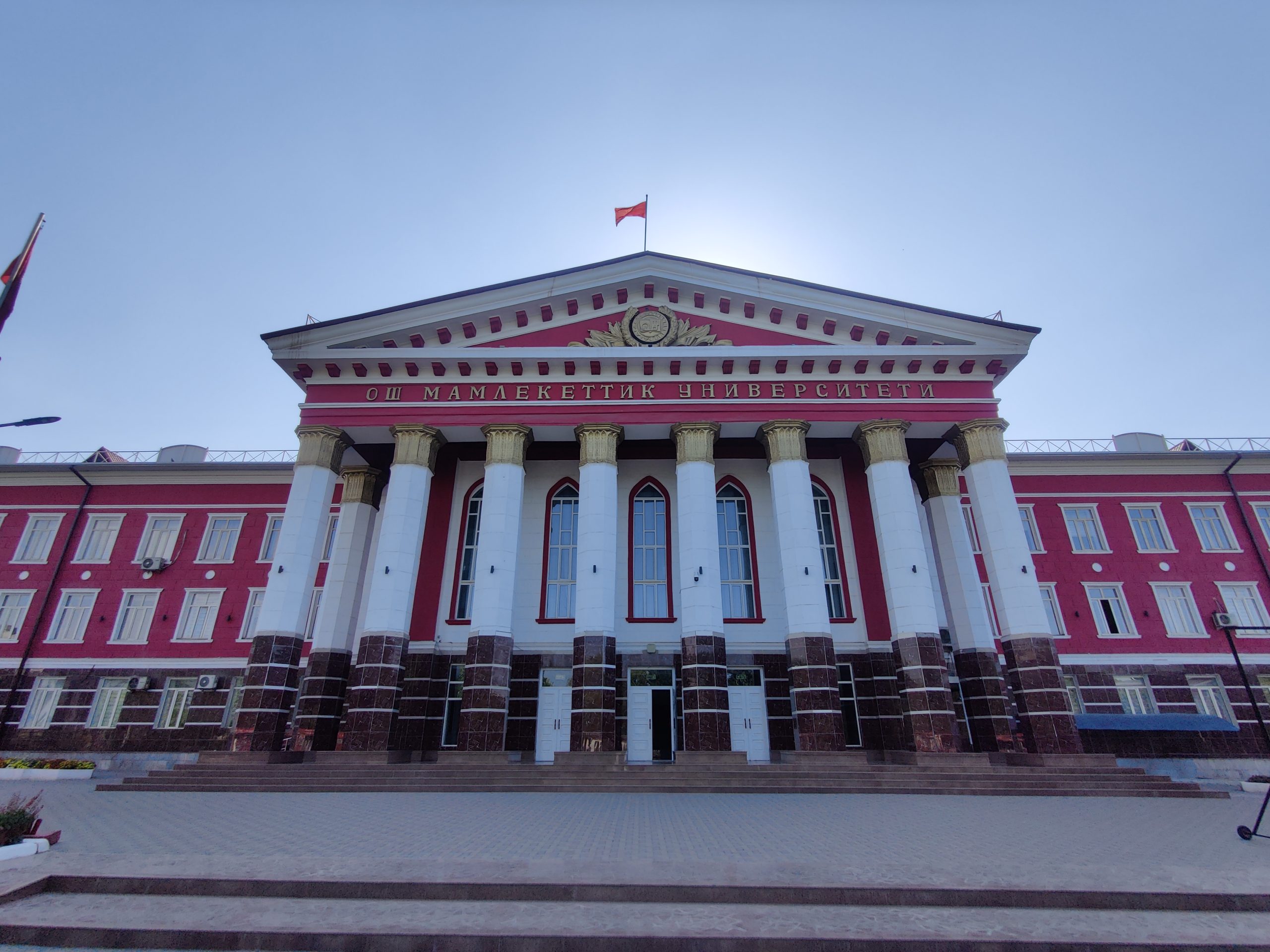 Walk past the side of Osh State University, towards its stunning façade (an amazing example of Soviet-era architecture). The university was originally established by the Kirghiz SSR in 1939 as a teacher training institute and was upgraded to a comprehensive pedagogical institute in 1951.