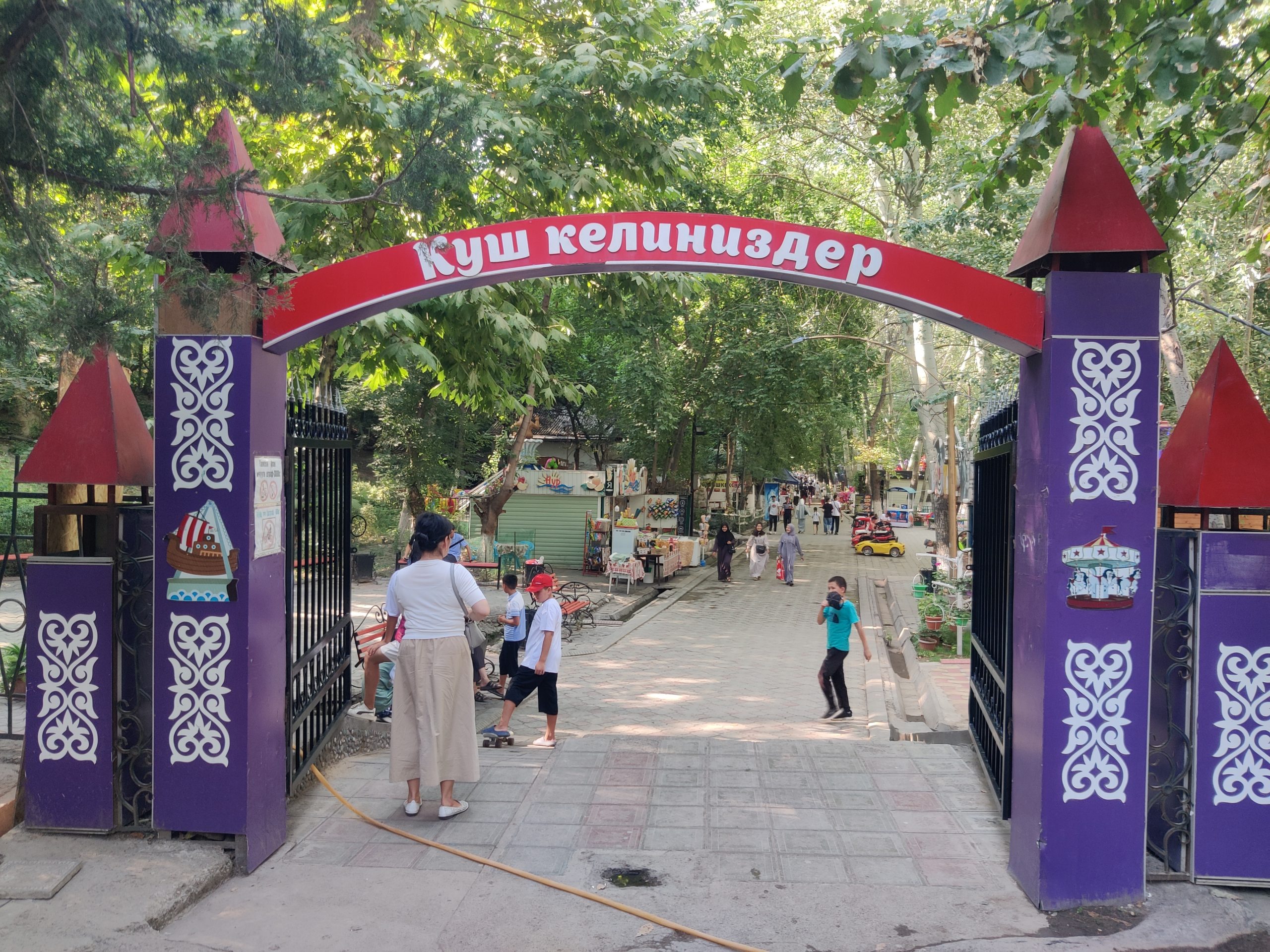 Continue descending through the leafy Alisher Navai Park, and cross the river via the walkable underside of the bridge. You’re now heading towards the beating heart of Osh — the chaotic, colorful bazaar! But before you dive into the stalls, look up. Do you see an airplane mural?