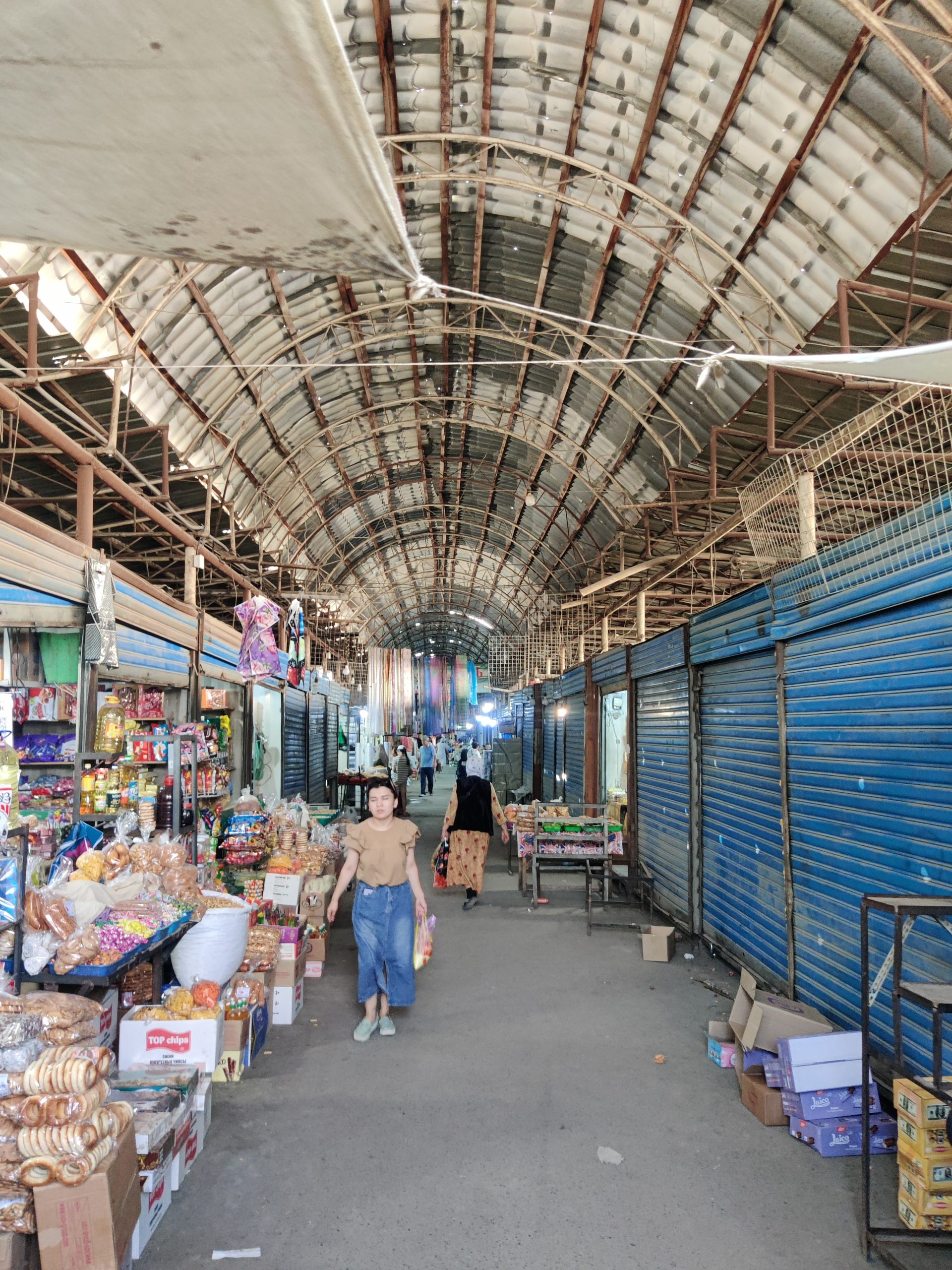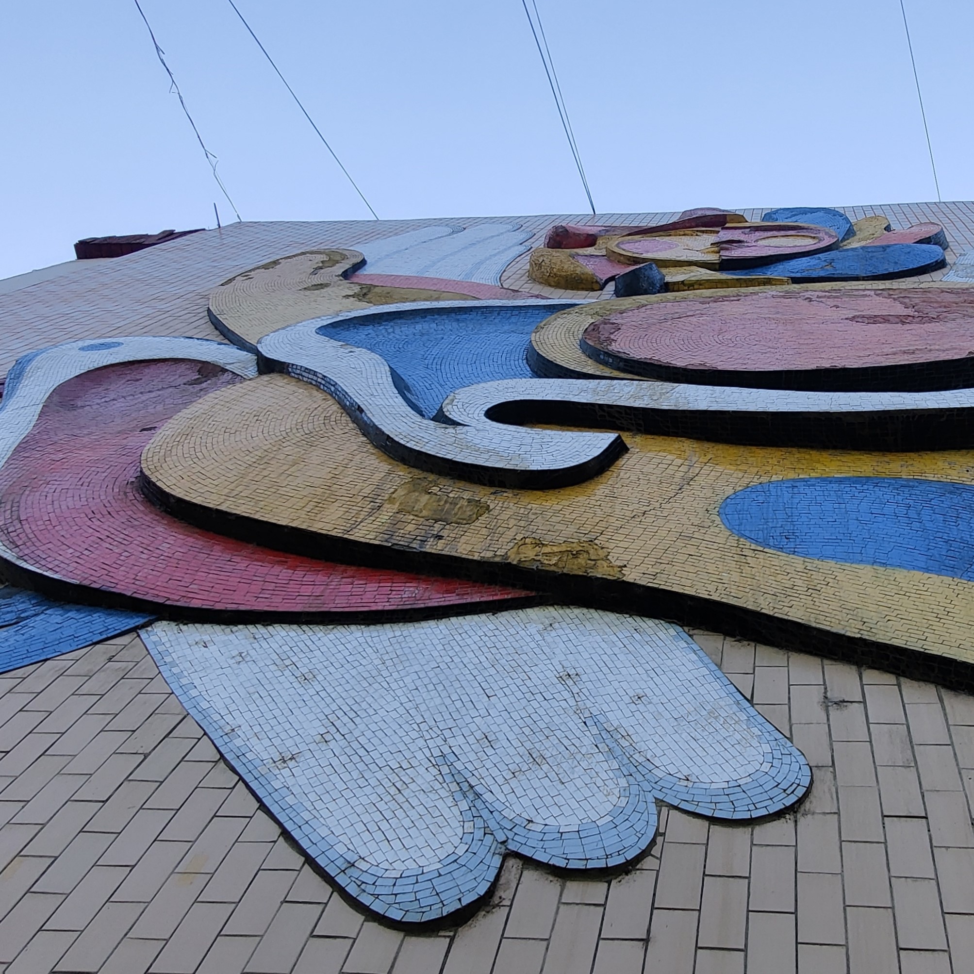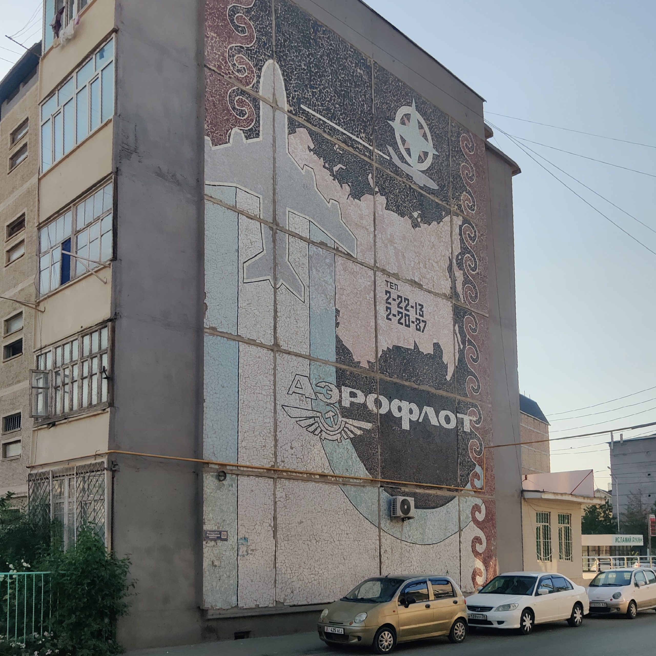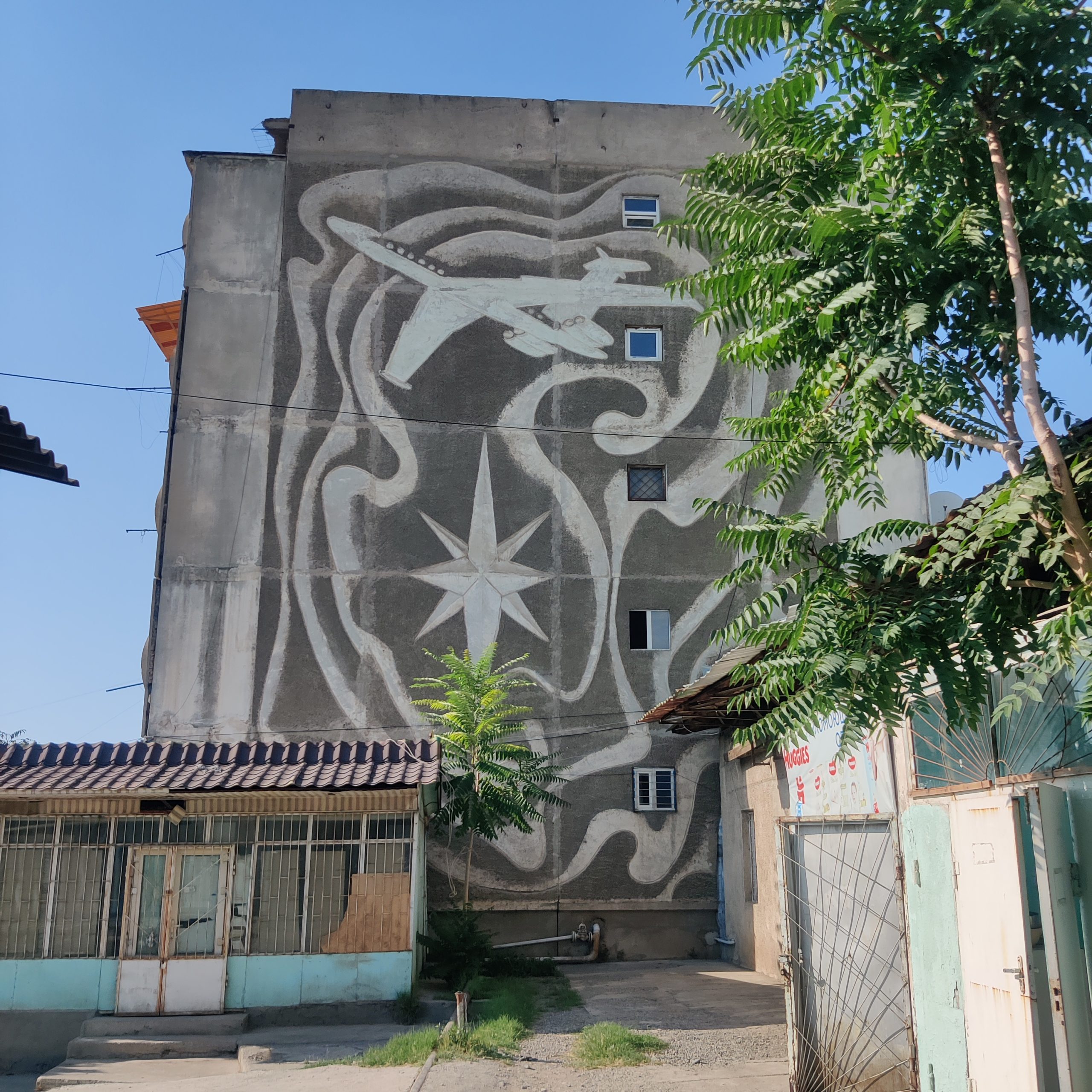 High above the bazaar is a giant sgraffito mural that seems to float: a stylized airplane soaring through space. This could be Aeroflot propaganda or a celebration of Soviet aeronautics — it’s hard to say. But its scale is impressive, and its survival remarkable. You can reach it by weaving through the bazaar’s maze of corridors and staircases, which is a charming part of the adventure itself.
