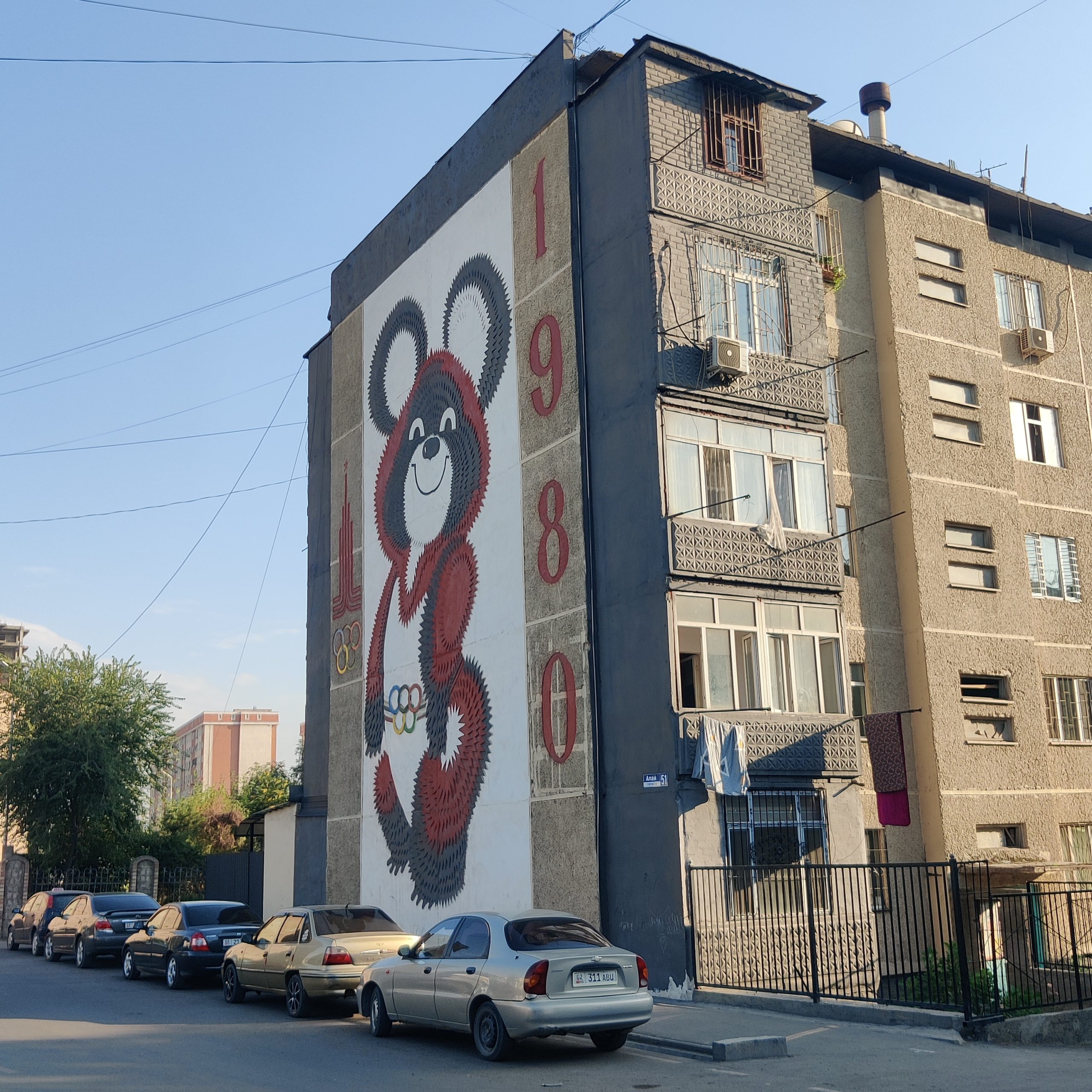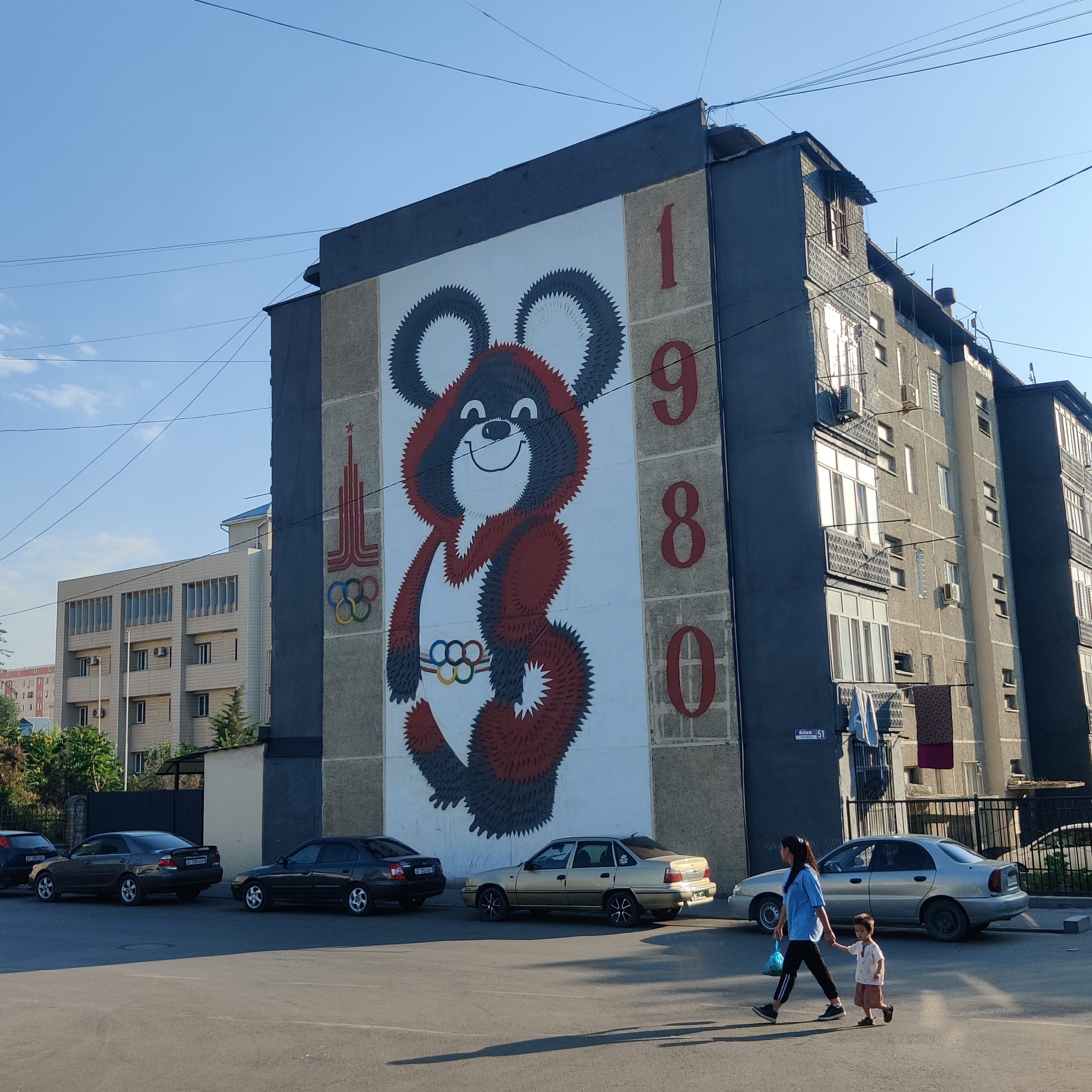 As you follow Masalieva Street, keep your eyes peeled. On a large wall in a seemingly random side street, Mishka—the 1980 Moscow Olympics mascot- is smiling widely. Rarely seen today, this jolly bear feels like a time capsule of an era when even mascots carried political weight. The layered sgraffito has been recently repainted, a sign that local heritage is still being cared for.