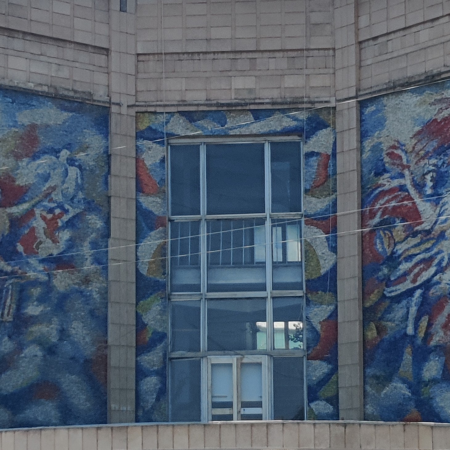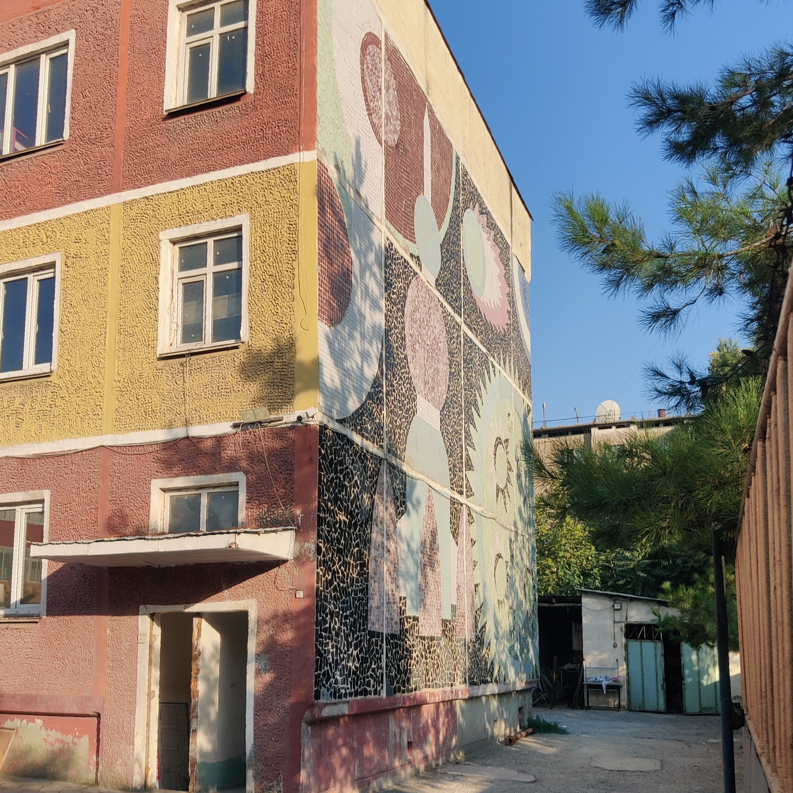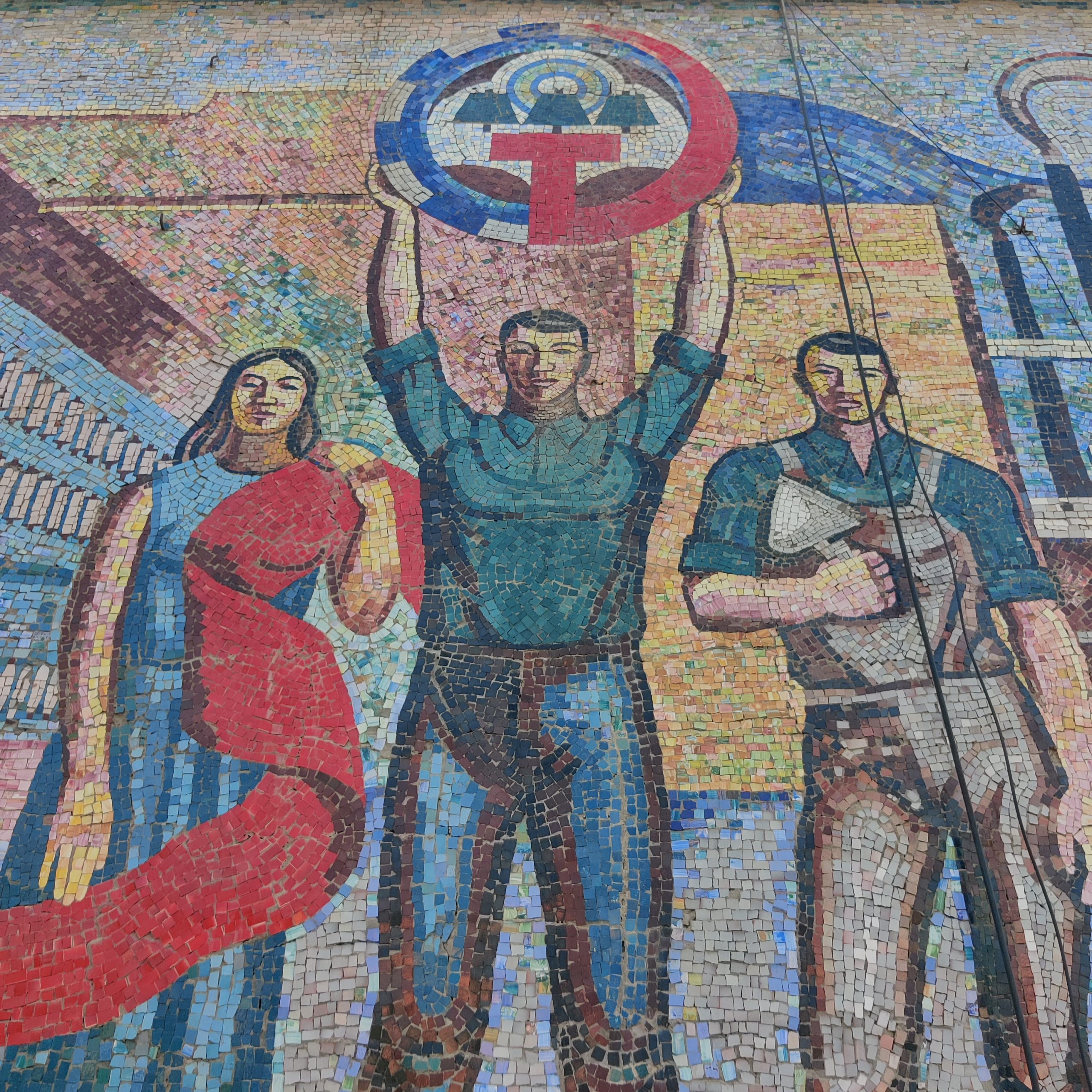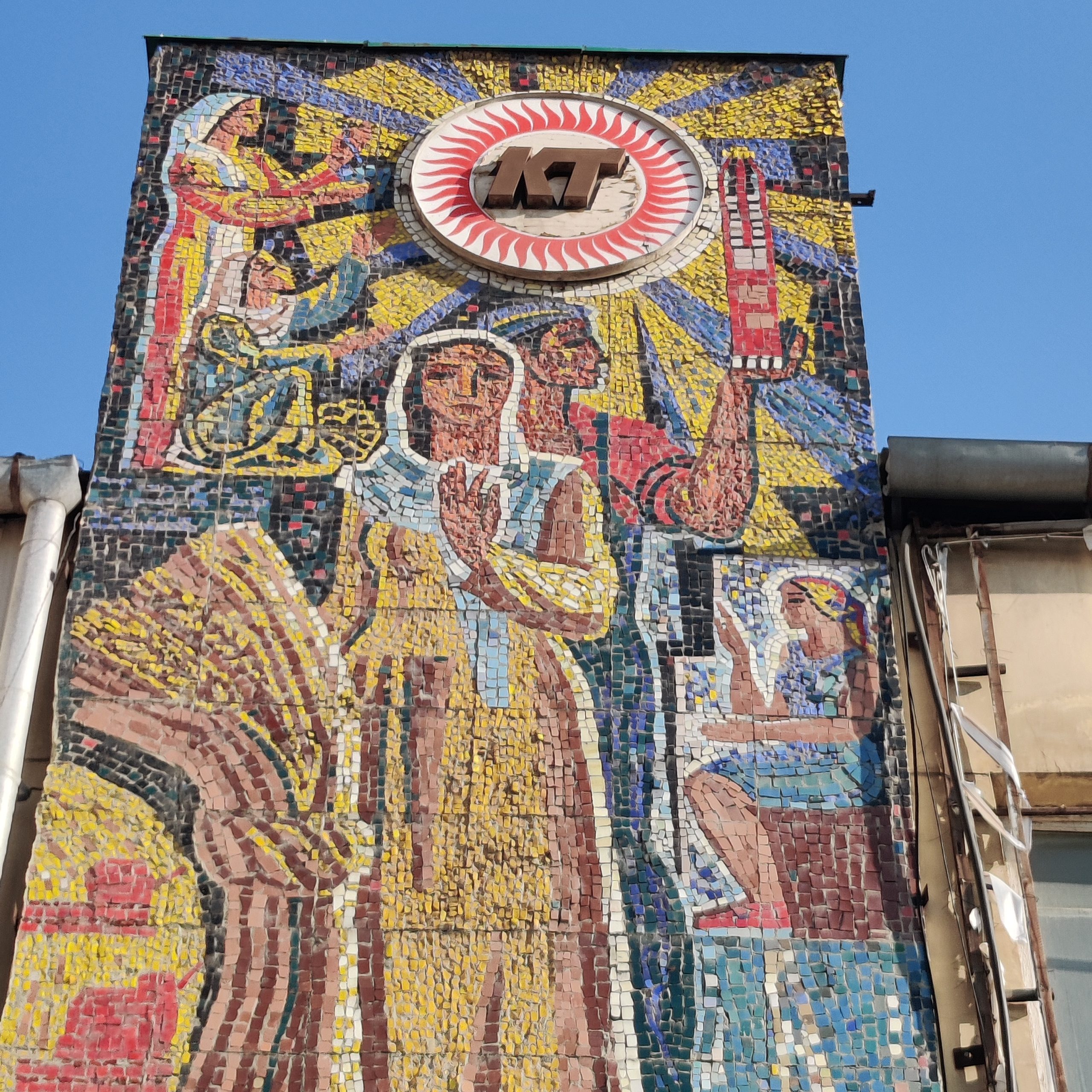 Cross the street and be rewarded with a riot of color. This large-scale mosaic features proud workers, golden wheat, and a palette of reds, oranges, and blues. It’s Soviet optimism in tile form, though the Hammer and Sickle emblem has been covered-up (“KT” sign).